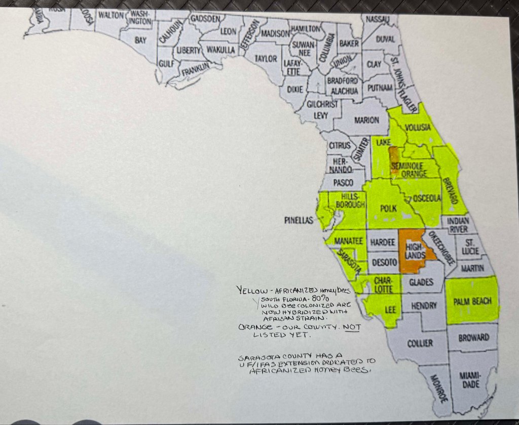 - South Florida: Africanized honey bees are heavily populated in Palm Beach, Hillsborough, Pinellas, and Lee counties.