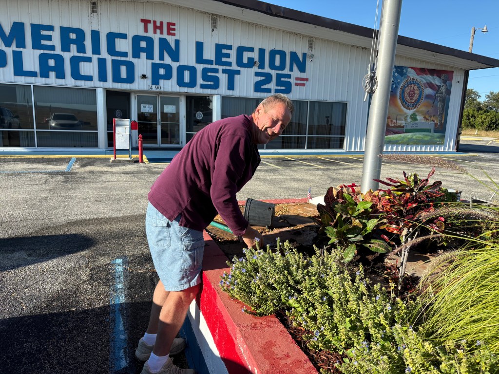 Mark Ponseler busy maintaining the garden at the American Legion. 10-2025