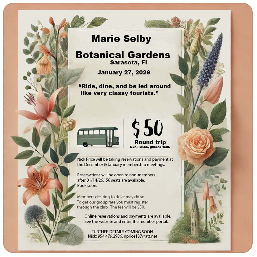 NOTE: Payment is required at time of online registration. Online fees include a small processing fee. The garden club does not keep this fee. If you choose not to register online you will need to see Nick at the December 10 or January 14 membership meetings. After January 14 left over seats will be available to non-member guests. Plan early to be sure you get a seat.